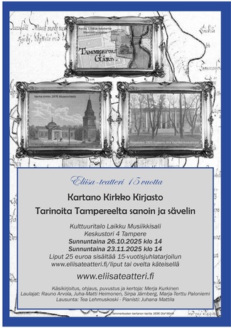 Kartano Kirkko KirjastoTarinoita Tampereelta sanoin ja sävelinTampereen kaupunki perustettiin vuonna 1779 Tammerkosken 1600-luvulla syntyneen kartanon maille. Päärakennuksen läheisyyteen rakennettiin kirkko, joka vihittiin käyttöön vuonna 1825. Sen valmistuttua kartanon rakennukset purettiin. Päärakennuksen paikalle nousi vuonna 1925 käyttöön otettu kirjastotalo. Eliisa-teatterin 15-vuotisjuhlaesitys kertoo Tammerkosken kartanon, 200-vuotiaan Vanhan kirkon ja 100-vuotiaan kirjastotalon tarinan sanoin ja sävelin. Käsikirjoitus, ohjaus ja puvustus: Merja Kurkinen Esiintyjät: Rauno Arvola, Juha-Matti Heimonen, Sirpa Järnberg, Merja Kurkinen, Tea Lehmuskoski, Juhana Mattila, Marja-Terttu Paloniemi Liput 25 euroa sisältää tarjoilun