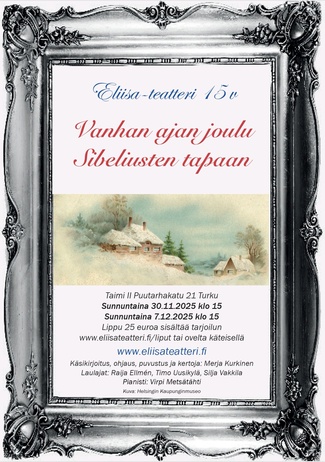 Vanhan ajan jouluSibeliusten tapaanOlkaatten tervetulleet viettämään tunnelmallista vanhan ajan joulua kauniiden ja muistorikkaiden sävelmien parissa ja kuulemaan tarinointia kansallissäveltäjä Jean Sibeliuksen perheen joulun vietosta. Kupponen kuumaa ja joululeivonnaiset maistuvat ennen saliin siirtymistä. Käsikirjoitus, ohjaus, puvustus ja kertoja: Merja Kurkinen Laulajat: Raija Ellmén, Timo Uusikylä ja Silja Vakkila Pianisti: Virpi Metsätähti Taimi II Puutarhakatu 21 Turku Sunnuntaina 30.11.2025 klo 15 Sunnuntaina 7.12.2025 klo 15 Lippu 25 euroa sisältää tarjoilun