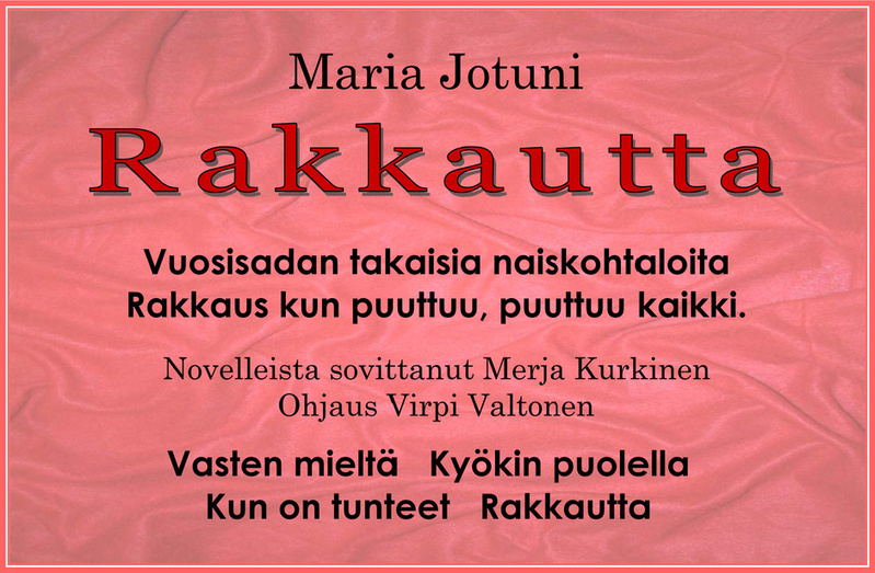 Eliisa-teatteri haluaa omalta osaltaan kiinnittää huomiota naisen asemaan ja tehdä sen historiallisen perspektiivin kautta. Teatteri on tullut tunnetuksi epookkinäytelmistään, jotka on toteutettu kullekin näytelmälle parhaiten sopivassa miljöössä. Kevääksi 2014 teatteri valmisti näytelmän Maria Jotunin tuotannosta. Jotunin novelleista valitut tekstit on julkaistu vuosina 1907-1913. Näytelmän nimeksi on valittu Rakkautta ja teksteistä välittyy Maria Jotunille tyypilliseen tapaan kyseenalaistava huumori. Kun nainen tuohon aikaan oli olosuhteistakin johtuen pakotettu valitsemaan tietyllä tavalla, niin teksteistä kuitenkin välittyy naisen analysoiva tapa tarkastella valintojaan.
