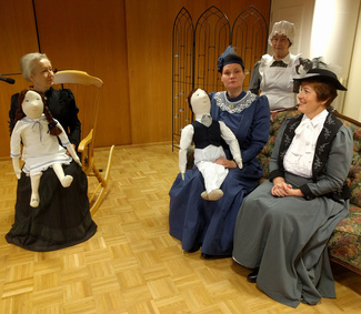 Merja Kurkinen, Tea Lehmuskoski, Liisa Virtanen ja Tarja Kalliokoski sekä Maijua ja Jussia esittävät nuket